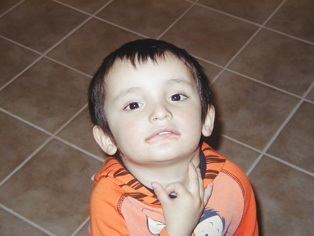 Travis. The red on his lips is frosting from a cake.