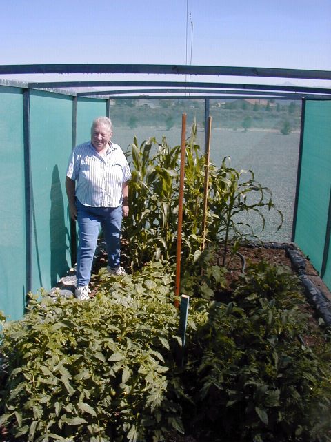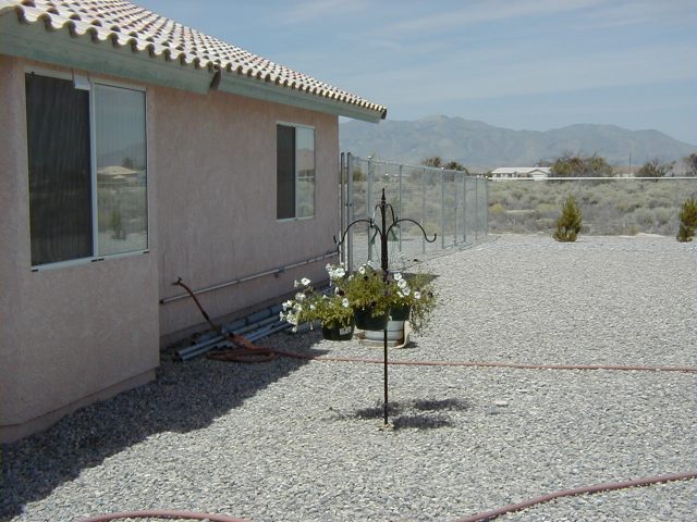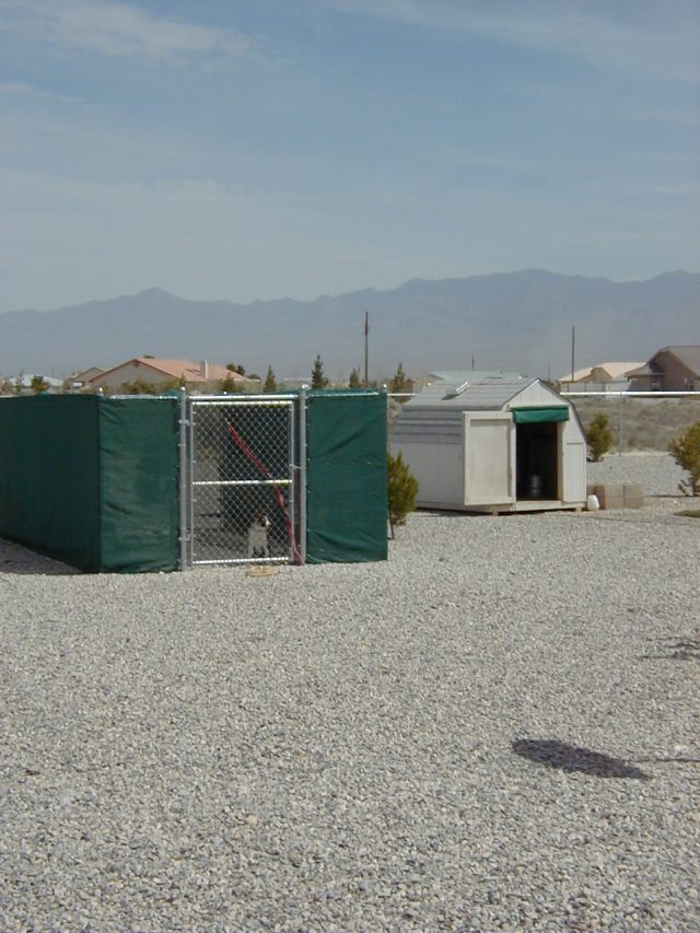 Our dog kennel. The green covering is a wind and sun screen. Our puppy Posie is looking through the door.
